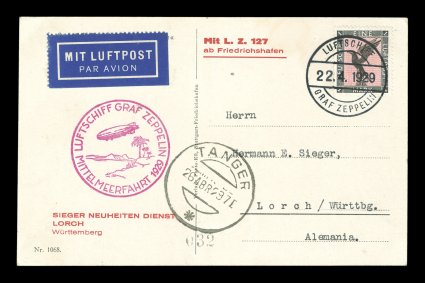 139 c Sieger #24b imageSieger #24b, 1929 Mediterranean Flight, Zeppelin view card with 1M Air Post tied by "Luftschiff/Graf Zeppelin/22. 4. 1929" on-board cancel, dropped at Tangier with Spanish receiving c.d.s. of April 26th, red flight cachet, all markings are well struck and on the address side, extremely fine (Sieger €500; Michel #20IIb). (Image) Est. 200-300