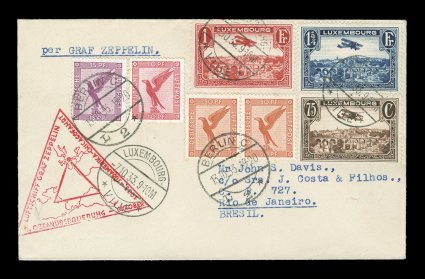 542 c Sieger #238E imageSieger #238E, 1933 Chicago Flight, mixed franking cover with three Luxembourg air posts tied by "Luxembourg/Ville/7. 10. 33." c.d.s., plus four German air posts tied by Berlin c.d.s., red German flight cachet on the front and Berlin connecting flight cachet on the reverse, backstamped Rio de Janeiro, very fine; there was actually a shuttle flight between Pernambuco and Rio de Janeiro, which both Sieger and Michel acknowledge, and this cover stayed on the Zeppelin for delivery in Rio de Janeiro on October 18th which makes this a different leg than the Pernambuco leg, though Michel does not list treaty-state postings to there (Sieger €500; Michel #348b). (Image) Est. 300-400