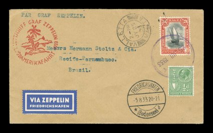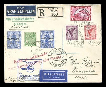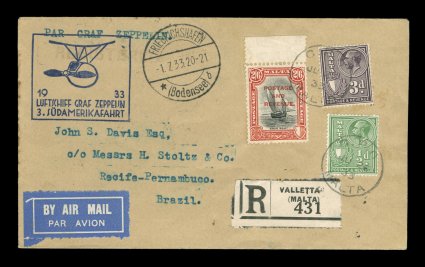 545 c Sieger #219Aa imageSieger #219Aa, 1933 Third South America Flight, neat registered cover with three stamps tied by "G. P. O./Malta/JU 26 33" c.d.s., violet flight cachet, Friedrichshafen transit c.d.s., backstamped Pernambuco, very fine; ex-Belinkoff (Sieger €600; Michel #315a var.). (Image) Est. 300-400