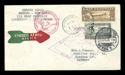 553 c Sieger #409T imageSieger #409T 1936 First North America Flight of the "Hindenburg", attractively franked cover for the return flight with four air posts of sole Mexican franking, tied by "Servicio Aereo/Mexico, D.F./6. May. 36." c.d.s., violet United States flight cachet, backstamped with Frankfurt Zeppelin machine cancel, cover slightly reduced at left, otherwise very fine; franking with only Mexican stamps was standard for this country unlike the many Latin American postings; signed Roger Koerber, Gappe (Sieger #€1,350; Michel #13). (Image) Est. 300-400
