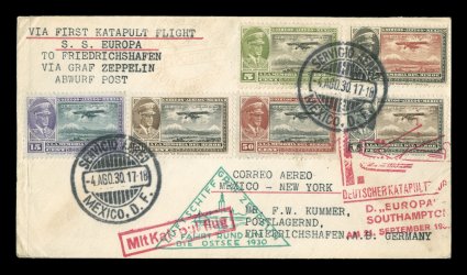 552 c Sieger #88AAb imageSieger #88AAb, Baltic Sea Flight, in combination with the catapult flight of the "Europa" on September 21, 1930 to Southampton, six air posts tied by "Servicio Aereo/Mexico, D.F./4. Ago. 30" c.d.s., addressed "poste restante" to Friedrichshafen, red catapult cachets, forwarded to Friedrichshafen and taken on board the Zeppelin for the Baltic Sea Flight, green flight cachet, with "Berlin-/Staaken/23. 9. 30" backstamp, light edge wrinkles at left, exceptionally colorful franking and very fine; Mexico did not have treaty-state status with the Zeppelin company and postings actually required postage from a recognized country, in this case the United States, however apparently United States postage was not required for the catapult flight, thus when the cover got to Europe and was delivered to Friedrichshafen it apparently was accepted aboard the Zeppelin without the proper mixed franking, this is very analogous to a similar Mexican posting on the 1930 Pan-American Flight (Sieger #64VIII) that was excepted with only Mexican stamps; an incredibly rare Mexican posting that is not listed in Sieger or Michel (Michel #127). (Image) Est. 1,500-2,000