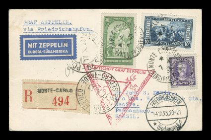 555 c Sieger #238Aaa imageSieger #238Aaa, 1933 Chicago Flight, three adhesives tied to registered card by "Monte Carlo/Principauil de Monaco/7 11 33" c.d.s., Friedrichshafen transit c.d.s., red German flight cachet, backstamped Pernambuco, trivial edge tear at left, very fine (Sieger €950; Michel #347a). (Image) Est. 300-400