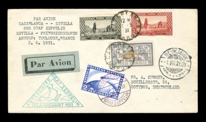 557 c Sieger #113B imageSieger #113B, 1931 Iceland Flight, unlisted posting from French Morocco with mixed franking of three adhesives tied by "Casablanca/Maroc/20 -5 31" c.d.s., plus German 2M Zeppelin single tied by on-board "Luftschiff/Graf Zeppelin/1. 7. 1931" c.d.s., Berlin transit on the reverse, green flight cachet, backstamped Reykjavik, a clean and very fine cover; this posting is not listed in Sieger or Michel and apart from the Pan-American Flight posting, this is the earliest French Morocco cover that we are aware, the seventh South America Flight of 1932 being the first listed by Sieger (Michel #193I). (Image) Est. 500-750