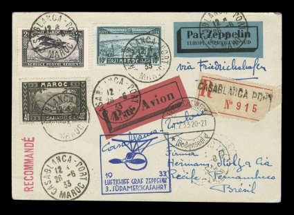 559 c Sieger #219Aa imageSieger #219Aa, 1933 Third South America Flight, registered card with three stamps tied by "Casablanca-Port/Maroc/26 -6 33" c.d.s., violet flight cachet, Friedrichshafen transit c.d.s., backstamped Pernambuco, very fine; ex-Kofler (Sieger €400; Michel #315a). (Image) Est. 200-300