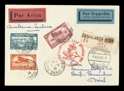 560 c Sieger #223Aa imageSieger #223Aa, 1933 Fourth South America Flight, neat registered card with three adhesives tied by "Casablanca-Port/1 -8 33" c.d.s., red flight cachet, Friedrichshafen transit c.d.s., backstamped Pernambuco, choice very fine; ex-Kofler (Sieger €400; Michel #323a). (Image) Est. 200-300