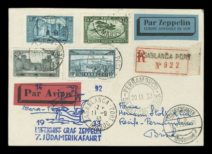 561 c Sieger #232Aa imageSieger #232Aa, 1933 Seventh South America Flight, registered card with four adhesives tied by "Casablanca-Port/Morac/11 -9 33" c.d.s., blue flight cachet on front and back, Friedrichshafen transit c.d.s., backstamped Pernambuco, very fine; ex-Kofler (Sieger €300; Michel #337a). (Image) Est. 200-300