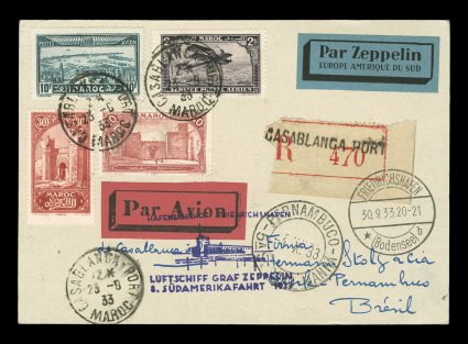562 c Sieger #235Aa imageSieger #235Aa, 1933 Eighth South America Flight, registered card with four adhesives tied by "Casablanca-Port/Maroc/23 -9 33" c.d.s., violet flight cachet, Friedrichshafen transit c.d.s., backstamped Pernambuco, very fine with all markings on the front; ex-Kofler (Sieger €300; Michel #343a). (Image) Est. 200-300
