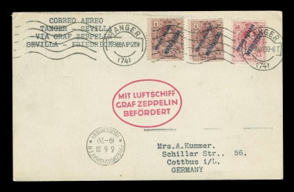 565 c Sieger #64XVII imageSieger #64XVII, 1930 Pan-American Flight, three adhesives tied to card by "Tanger/27 May 30" roller cancel, for the return flight from Seville to Friedrichshafen, Seville transit of June 2 where it boarded the Zeppelin, red oval Zeppelin cachet, backstamped Friedrichshafen, very fine; one of only 20 cards flown; signed Roger Koerber (Sieger €2,000; Michel #68Ad). (Image) Est. 500-750