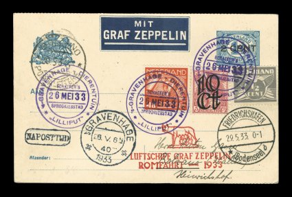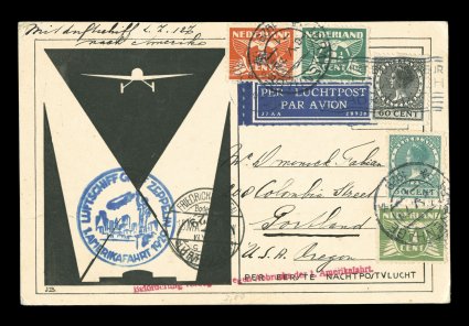 568 c Sieger #26A imageSieger #26A, 1929 Interrupted America Flight, five adhesives tied to air post card by "Gravenhage/8. V. 1929" c.d.s., blue flight cachet and straight line delay cachet, Friedrichshafen transit and backstamped New York, slightly nibbed corners, very fine and the first treaty state posting of this country (Sieger €350; Michel #23). (Image) Est. 150-200