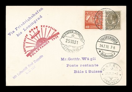 570 c Sieger #119E imageSieger #119E, 1931 Polar Flight, lovely card with 40c Orange red air post along with another adhesive tied by "Gravenhage/18. VII. 1931" c.d.s., Friedrichshafen transit and flown on the leg to Leningrad with that city's receiving c.d.s. of July 25th, red flight cachet, backstamped Basel where addressed, very fine and handsome (Sieger €350; Michel #203a). (Image) Est. 150-200
