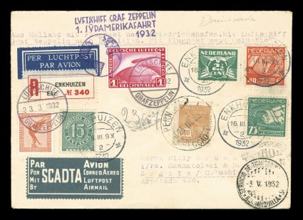 572 c Sieger #138Aa var. imageSieger #138Aa, 1932 First South America Flight, attractive cover with quadruple mixed franking for onward air transmission from Brazil into Colombia, three adhesives of Netherlands tied by "Enkhuizen/16. III. 32" c.d.s., German 1M Zeppelin single and 50pf Orange air post tied by "Luftschiff/Graf Zeppelin/23. 3. 1932" on-board c.d.s. in route, backstamped on the same day in Pernambuco, violet flight cachet, then Brazil adhesive tied by Pernambuco c.d.s. and a Colombia SCADTA air post tied by a Enkhuizen c.d.s., very fine; after leaving Brazil this cover was forwarded to New York, then on to Barranquilla and backstamped Bogota, all of which is documented on the back by numerous transits and backstamps; a lovely combination usage that is not mentioned for this flight by either Sieger or Michel (Michel #234a). (Image) Est. 400-500