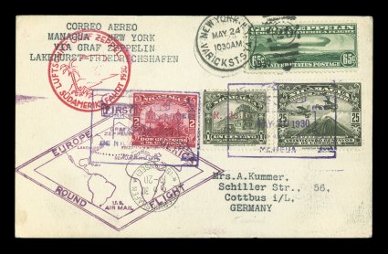 576 c Sieger #64IX imageSieger #64IX, 1930 Pan-American Flight, an exceptionally scarce mixed franking card with three Nicaraguan adhesives including one air post tied by boxed "Correo Aereo/May 20, 1930/Managua" pmk., plus U.S. 65c Zeppelin tied to "New York, N.Y./Varick St. Sta./May 24, 1930" duplex, flown on the return flight from Lakehurst to Friedrichshafen, red German and violet American return flight cachets, backstamped Friedrichshafen, an attractive and fresh card, very fine; exceptionally rare with Sieger reporting only eleven mixed franking items flown, this being one of only five cards with the 65c Zeppelin stamp and the first card we have seen (Sieger €1,800; Michel #68Gb). (Image) Est. 2,000-3,000
