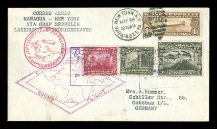 578 c Sieger #64IX imageSieger #64IX, 1930 Pan-American Flight, Behrens-Neuheiten-Dienst imprinted registered cover with five Nicaraguan air posts on the front and three adhesives on the reverse, tied by red boxed "Correo Aereo/May 15, 1930,/Managua" pmks. or similar violet c.d.s. on the reverse, this cover was prepared to fly the Zeppelin from Cuba to Lakehurst but when the Zeppelin failed to land at Cuba the cover went by ship to Lakehurst, Cuba transit of May 18, 1930, U.S. $1.30 Zeppelin neatly tied by "New York, N.Y./Grand Central Sta./May 27, 1930" duplex, flown on the return flight from Lakehurst to Friedrichshafen, red German and violet American return flight cachets, backstamped Friedrichshafen, a very fine and handsome cover; exceptionally rare with Sieger reporting only eleven mixed franking items flown, this being one of only six covers with the $1.30 Zeppelin stamp (Sieger €1,800; Michel #68Gb). (Image) Est. 2,000-3,000