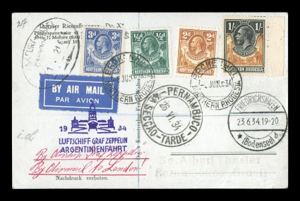 585 c Sieger #254Aa imageSieger #254Aa, 1934 Third South America Flight (Argentina Flight), attractively franked photo card of the Dornier "Do-X" with four adhesives tied by "Broken Hill/Northern Rhodesia/8 Jun 34" c.d.s., routed through Friedrichshafen with transit c.d.s. and Frankfurt-Basel railway cancel, violet flight cachet, backstamped Pernambuco, trivial corner crease of no consequence, very fine; few Zeppelin covers were made from this country and this popular Argentina flight is particularly desirable (Sieger €650; Michel #370a). (Image) Est. 1,000-1,500