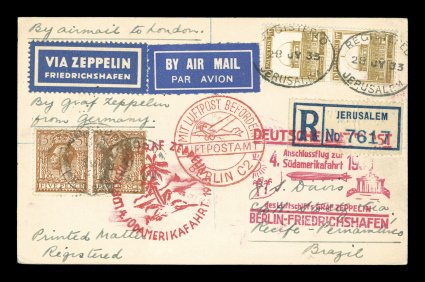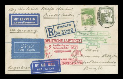 588 c Sieger #223B imageSieger #223B, 1933 Fourth South American Flight, an unlisted flight for Palestine being an attractive mixed franking card with Palestine 13m Olive bister vertical pair tied by "Registered/Jerusalem/28 JY 33" ovals, plus a pair of Great Britain 5p Brown tied by London c.d.s., red flight cachet and Berlin connecting flight cachet, backstamped Pernambuco, choice very fine and a highly desirable mixed franking posting; only four flights are listed by Sieger in 1933, the first year for this treaty state, this Fourth South America Flight is listed by neither Sieger nor Michel, nor have we seen another example of this flight in the major Zeppelin collections (Michel #323b). (Image) Est. 1,500-2,000