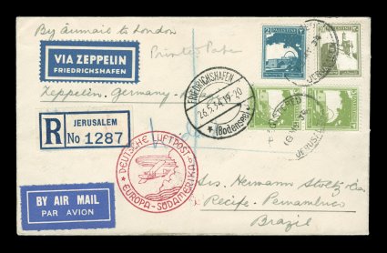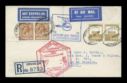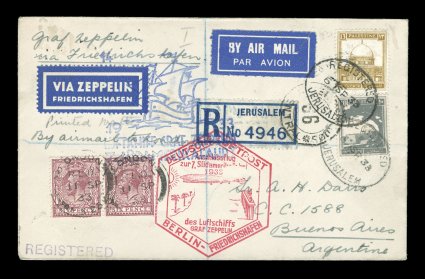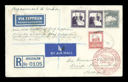 593 c Sieger #302Bb imageSieger #302Bb, 1935 Fifth South America Flight, registered cover with four adhesives of only Palestinian franking, tied by "Regestered/Jerusalem/28 MY 35" ovals, connecting with the Zeppelin through Berlin with red general Zeppelin flight cachet with index letter "a" for the Berlin connection, backstamped Pernambuco, very fine; an attractive late period flight from this popular country; this treaty-state posting not listed by Michel (Sieger €1,500; Michel #446a). (Image) Est. 400-500