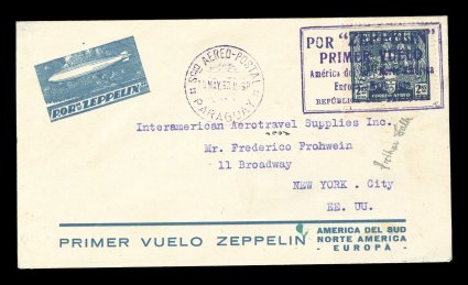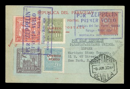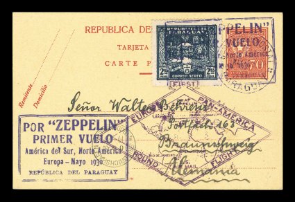 596 c Sieger #62B imageSieger #62B, 1930 Pan-American Flight, 70c postal card with additional 2.85P Blue tied by boxed violet flight cachet and Paraguay c.d.s. of May 19, 1930, additional strike of flight cachet at left plus violet American flight cachet, backstamped Friedrichshafen, all markings are on the front of the card, very fine and choice; a scarce card with only 65 items flown on this leg (Sieger €1,200; Michel #68E). (Image) Est. 500-750