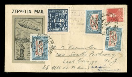 598 c Sieger #62Ca imageSieger #62Ca, 1930 Pan-American Flight, mixed franking cover with printed A.C. Roessler cachet for the flight to Lakehurst, 2.85P Blue tied by the boxed violet flight cachet, in mixed franking with four Argentina adhesives, including three 1P Blue and rose with green Zeppelin overprint, all tied by "Aeropostal-B.A./Argentina/21. May. 30." c.d.s., Argentina transit on the reverse and backstamped Lakehurst, light cover wrinkles not affecting the stamps, very fine (Sieger €700; Michel #66Ed). (Image) Est. 300-400