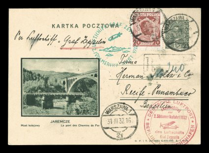 600 c Sieger #143B imageSieger #143B, 1932 Second South America Flight, 15g Dark green pictorial postal card with seven additional adhesives on front and back, tied by Warsaw c.d.s., green flight cachet and red Berlin connecting flight cachet, backstamped Buenos Aires, very fine (Sieger €450; Michel #237b). (Image) Est. 300-400