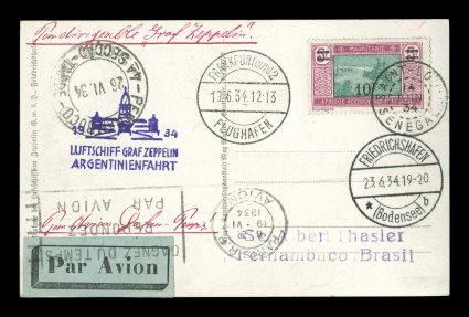 662 c Sieger #254Aa imageSieger #254Aa, 1934 Third South America Flight (Argentina Flight), a rare posting from Senegal, lovely Zeppelin photo card with three adhesives of Mauritania tied to front and back by "Saint Louis/Senegal/14 Juin 34" c.d.s., via Paris and Frankfurt through Friedrichshafen with transit c.d.s. and violet flight cachet, backstamped Pernambuco, very fine; a nice example of this flight of 1934 with pictorial cachet (Sieger €1,000; Michel #370a). (Image) Est. 750-1,000