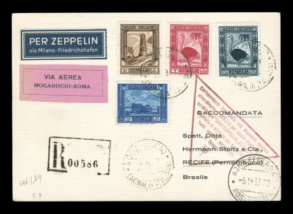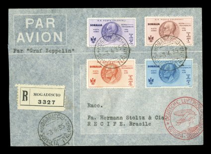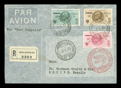 664 c Sieger #229Aa imageSieger #299Aa, 1935 Fourth South America Flight, unlisted Zeppelin flight cover with four values of the 1934 air post semi-postal set tied by "Mogadiscio/Somalia Italiana/3. 4. 35" c.d.s., connecting with the Zeppelin through Friedrichshafen via Rome with red general Zeppelin flight cachet with index letter "c" for the Friedrichshafen connection, backstamped Pernambuco, very fine; a late period Zeppelin flight that is not listed by either Sieger or Michel (Michel #442a). (Image) Est. 400-500