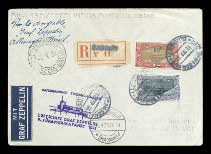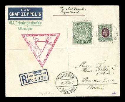 668 c Sieger #235Aa imageSieger #235Aa, 1933 Eighth South America Flight, a rare registered cover from the popular Somali Coast, two singles tied by "Cote Fss des Somalis/Djibouti/12 Sep 33" c.d.s., violet flight cachet, via Marseilles to Friedrichshafen with transit c.d.s., backstamped Pernambuco, light vertical edge bend at right, very fine (Sieger €800; Michel #343a). (Image) Est. 750-1,000