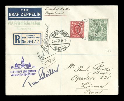 670 c Sieger #254Aa imageSieger #254Aa, 1934 Third South America Flight (Argentina Flight), lovely and rare registered cover of British Somaliland, two adhesives tied by "Berbera/British Somaliland/262 MY 34" c.d.s., via Aden through Friedrichshafen with transit c.d.s. and violet flight cachet, backstamped Lima, Peru, also signed by two members of the crew, very fine and exceedingly choice; this flight with pictorial cachet is the key posting for this country according to Sieger, a rare and desirable cover in this premium condition (Sieger €1,400; Michel #370a). (Image) Est. 1,000-1,500