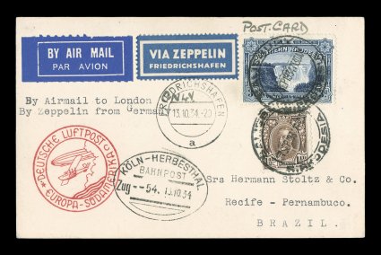 671 c Sieger #280Aa imageSieger #280Aa, 1934 Tenth South America Flight, lovely card with two adhesives tied by "Salsbury/S. Rhodesia/7 Sep 1934" c.d.s., to Friedrichshafen with nice Koln-Herbesthal railway transit oval and Friedrichshafen transit c.d.s., general Zeppelin flight cachet with index letter "c", backstamped Pernambuco, very fine; an exceptionally difficult country from which to acquire a Zeppelin cover as Sieger only lists four flights from Southern Rhodesia, attractive and rare card (Sieger €1200; Michel #410a). (Image) Est. 750-1,000