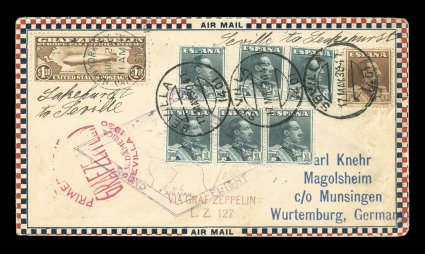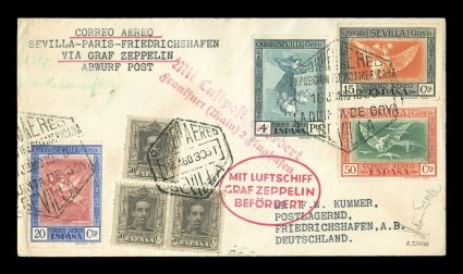 673 c Sieger #58B/64G imageSieger #58B/64G, 1930 Pan-American Flight, rare combination franking for the round trip from Seville to Seville with seven Spanish adhesives tied to cover by "Sevilla/17. May. 30" c.d.s., red Spanish flight cachet, backstamped Lakehurst, then U.S. $1.30 Zeppelin single tied by "New York, N.Y./Varick St. Sta./May 31, 1930 duplex for the return flight with violet American return flight cachet, backstamped Seville, minor edge wear to cover not affecting the stamps or markings; this return flight to Seville is a scarcer leg and particularly so in combination with Spanish franking for this round-trip cover; this cover and the next lot are the only two covers we have seen with Spain and United States franking (Michel #66A/68Ge; not listed thus in Sieger or Michel). (Image) Est. 500-750