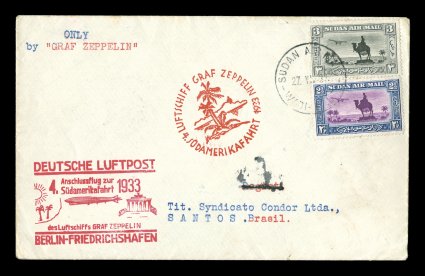 676 c Sieger #202B imageSieger #202B, 1933 First South America Flight, two air posts tied to cover by "Sudan Air Mail/Wadi-Halfa/25. IV. 33." c.d.s., blue flight cachet and Berlin connecting flight cachet, backstamped Santos, slight edge wrinkles and staining to cover, otherwise very fine; a rare Zeppelin cover from this country, this being the first flight listed by Sieger (Sieger €1,250; Michel #294b). (Image) Est. 500-750