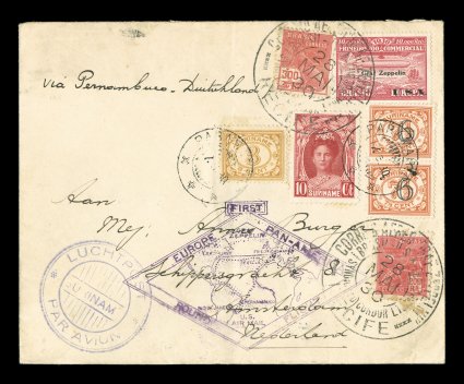 680 c Sieger #59 var. imageSieger #59 var., 1930 Pan-American Flight, an unusual mixed franking cover with four adhesives of Surinam tied by "Paramaribo/14. 5. 30" c.d.s. routed to Brazil with 10,000r "Graf Zeppelin/U.S.A" overprint and two other adhesives tied by "Recife/28 Mai 30" large special cancel, violet American flight cachet, backstamped Friedrichshafen, light vertical fold slightly affecting one stamp, very fine; a very scarce posting from this flight not really specifically listed in Sieger which lists a #57 which would be in connection with a German posting from Friedrichshafen, a Sieger #64 variety would be through Lakehurst for the return flight, this is clearly a Brazilian posting so we have used Sieger #59 var. (Michel #68Be; this country not mentioned in Michel). (Image) Est. 750-1,000