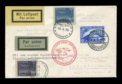 681 c Sieger #57A imageSieger #57A, 1930 Pan-American Flight, an unlisted posting from Sweden for this popular flight, two Swedish air posts tied to cover by "Stockholm/Luftpost/15. 5. 30" c.d.s. in connection with the first night flight from Stockholm to Hanover and directed to Friedrichshafen for the first leg of the Zeppelin flight to Seville, German 2M South America Flight Zeppelin single in mixed franking tied by "Luftschiff/Graf Zeppelin/19. 5. 1930" c.d.s., backstamped Seville, very fine; this is posted precisely the same way as other countries that did not have treaty state status, such as Italian area postings, and certainly was a proper routing for a Pan-American Flight posting (not a re-posting), very rare and the only example we have ever encountered (Michel #62; this posting from Sweden is not mentioned in either Sieger or Michel). (Image) Est. 2,000-3,000