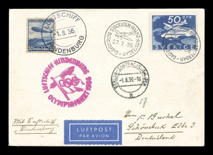 685 c Sieger #427A imageSieger #427A, 1936 Olympic Flight of the "Hindenburg", the impressive and unique posting of Sweden on the highly popular and important Olympic "Hindenburg" flight, a mixed franking card with Swedish 50o Bromma Airport commemorative tied by the special Stockholm-Malmo-Amsterdam daylight flight c.d.s. of July 27, 1936, in mixed franking with a German 75pf Zeppelin single tied by "Luftschiff/Hindenburg/1. 8. 36" on-board Zeppelin c.d.s., this being very unusual as most treaty-state postings of this flight, especially the mixed frankings, connected with Zeppelin at the Frankfurt Rhein-Main airport and received that cancellation, beautifully struck magenta flight cachet, and receiving the Berlin airport arrival cancel so that all the markings are on the front of this card, extremely fine; the Olympic Flight is not only popular with Zeppelin collectors but with those building worldwide collections of Olympic related material; the card offered here is believed to be the only example of a posting from Sweden on this flight, it is not listed in Sieger but is listed as one of the key postings for this flight by Michel; ex-Gauss, Repkin (Michel #32Ib; €1,500). (Image) Est. 2,000-3,000