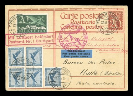 686 c Sieger #23IA imageSieger #23IA, 1929 Orient Flight, 20c postal card with additional 20c Swiss air post tied by "Zurich Flugplatz/Luftpost/22. III. 29" c.d.s., in mixed franking with 20pf German air post block of four and single tied by Friedrichshafen c.d.s., red lilac Ty. I flight cachet and Stuttgart air post forwarding cachet, boxed Haifa backstamp on March 30th, horizontal fold to the card not affecting the stamps, plus a small corner crease slightly affecting one stamp in the block, very fine appearance; this flight is the rarest of the mixed franking pre-treaty state postings of Switzerland with only a few covers known flown on this flight; this cover is illustrated on page 72 of "Die Orientfahrt Die Agyptenfahrt des LZ 127 - Graf Zeppelin" by Fred F. Blau and Cyril Deighton (Sieger €2,400; Michel #18I). (Image) Est. 1,000-1,500