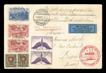 687 c Sieger #30Ad imageSieger #30Ad, 1929 Round-the-World Flight, cover flown on the Friedrichshafen to Friedrichshafen round trip of this flight, 75c Violet air post pair along with five other franc values tied by "Lenk/(Bern)/14. VIII. 29." c.d.s., red flight cachet Friedrichshafen transit and backstamp, very fine (Sieger €300; Scott for air post stamps $110.00; Michel #32). (Image) Est. 150-200