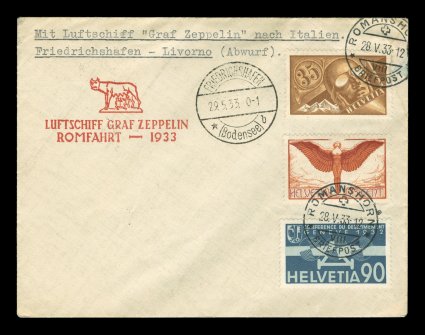 688 c Sieger #207Aa imageSieger #207Aa, 1933 Italian Flight, three air posts tied by "Romanshorn/Briefpost/28. V. 33." c.d.s., dropped at Livorno and receiving that city's backstamp, red German flight cachet, Friedrichshafen transit c.d.s., very fine; most of the mail dropped at Livorno did not receive backstamps and ones, such as this, with the backstamp are quite scarce; (Sieger €450; Michel #302Ia). (Image) Est. 200-300