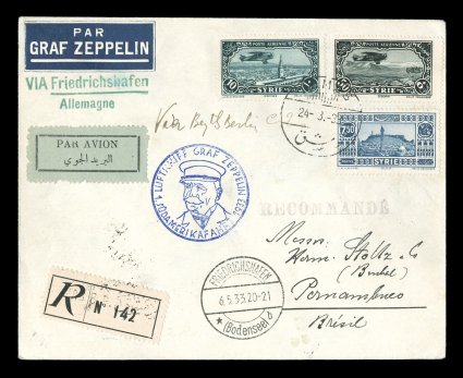 692 c Sieger #202Aa imageSieger #202Aa, 1933 First South America Flight, attractive registered with three adhesives tied by "Damas/24. 3. 33" c.d.s., blue flight cachet, a Friedrichshafen posting with transit c.d.s., but also with a Berlin transit though not by connecting flight, backstamped Pernambuco, fresh and very fine; an exceptionally rare treaty-state posting from Syria of which only five flights are recorded by Sieger from this country; ex-Kofler (Sieger €1,750; Michel #294a). (Image) Est. 1,000-1,500