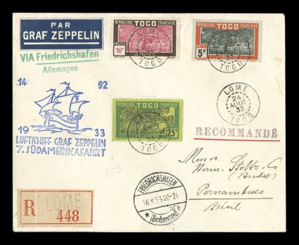 695 c Sieger #232Aa imageSieger #232Aa, 1933 Seventh South America Flight, handsome registered cover attractively franked with three adhesives tied by "Lome/Togo/24 Aout 33" c.d.s., blue flight cachet, via Dakar and Paris to Friedrichshafen with transit c.d.s., backstamped Pernambuco, very fine; a highly desirable and rare cover from this French African colony which is only known to have Zeppelin covers on a half dozen flights (Sieger €1,350; Michel #337a). (Image) Est. 1,000-1,500