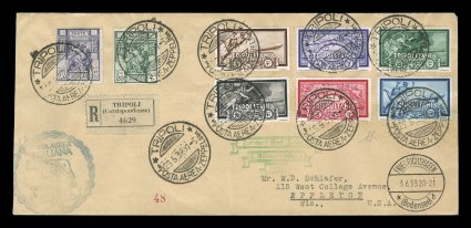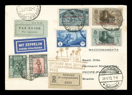697 c Sieger #183Aa imageSieger #183Aa, 1932 Seventh South America Flight, registered card attractively franked with seven adhesives of Italian Colonies issue, Lybia and Tripilotania, all tied by "Posta Aerea/Tripoli d'Africa/22. 9. 32" c.d.s., Friedrichshafen transit c.d.s., brown flight cachet, backstamped Pernambuco, very fine (Sieger €350; Michel #279a). (Image) Est. 200-300