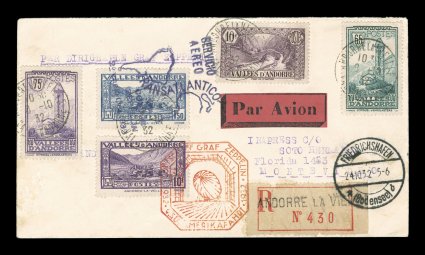 261 c Sieger #195Aa imageSieger #195Aa, 1932 Ninth South America Flight, attractive registered cover with five adhesives tied by "Andorre la Vielle/d'Andorre/8 -10 32" c.d.s., via France to Friedrichshafen with transit c.d.s., orange flight cachet, posted to Montevideo and not backstamped but receiving the violet flight cachet of Argentina which was used on Uruguayan mail, very fine and unusual (Sieger €350; Michel #286a). (Image) Est. 300-400