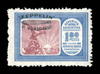 273 c Sieger #63E-G imageSieger #63E-G, 1930 Pan-American Flight, impressive large cacheted full set cover to Friedrichshafen with 20c-3.60P Green Zeppelin overprints cplt., includes two examples of each of the four low values and one of the key 1.80P value, all tied by "Serv. Aeropostal/Buenos Aires/21. May. 30." c.d.s., violet American flight cachet, backstamped Friedrichshafen, very fine; with so few issued of the 1.80P value with green overprint flown covers are of the greatest rarity and especially in this format to Europe (Image) Est. 1,000-1,500