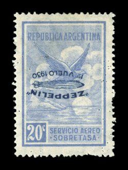 267 og C20 var. image#C20 var., 1930 20c "Zeppelin/1er Vuelo 1930" blue inverted overprint, well centered with bright color, o.g., lightly hinged, small pinholes that are similar to fine perforated initials but no pattern is identifiable, very fine appearance; not listed in Scott (Sieger €750). (Image) Est. 200-300