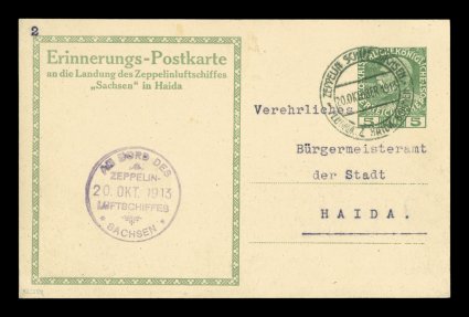 274 c Sieger #9Ab imageSieger #9Ab, 1913 Haida Flight of the "Sachsen" (LZ 17), 5h Green postal card with view of the airship "Sachsen" over Haida, cancelled with Ty. I "Zeppelin Schiff Sachsen/Flugplatz Haida, Bohemia/20. Oktober 1913" on-board postmark, nicely struck violet on-board cachet of the "Sachsen" on the same date, markings are all sharp and a very clean card, extremely fine; one of only a couple of international flights that were performed in the pioneer period; (Sieger €1,250; Michel #17Gc). (Image) Est. 500-750
