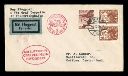 275 c Sieger #86 imageSieger #86, 1930 Geneva Flight, three air posts neatly tied to cover by "Wien/12. IX. 30" c.d.s., red oval Zeppelin cachet and special Geneva Zeppelin backstamp of September 14th, very fine and attractive (Sieger €425; Michel #123). (Image) Est. 150-200