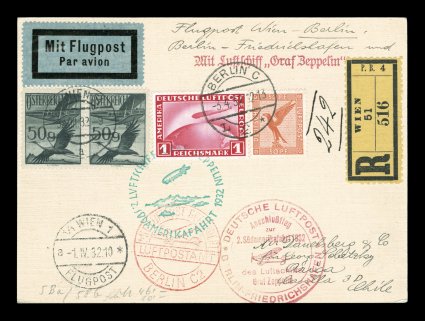 278 c Sieger #143B imageSieger #143B, 1932 Second South America Flight, mixed franking card with horizontal pair of 50g Gray blue Austrian air posts tied to card by Vienna c.d.s., German 1M Zeppelin single and 50pf Orange air post tied by "Berlin/3. 4. 32." c.d.s., green flight cachet and red Berlin connecting flight cachet, backstamped Arica, very fine (Sieger €535; Michel #237b). (Image) Est. 300-400