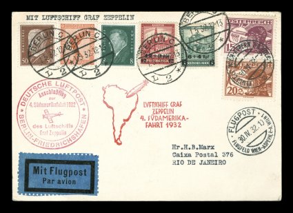 280 c Sieger #157B imageSieger #157B, 1932 Fourth South America Flight, attractive mixed franking card with two Austrian air posts tied by Vienna air field pmk. and five German adhesives tied by "Berlin/1. 5. 32." c.d.s., orange flight cachet and red Berlin connecting flight cachet, to Rio de Janeiro, very fine (Sieger €550; Michel #241b). (Image) Est. 300-400