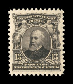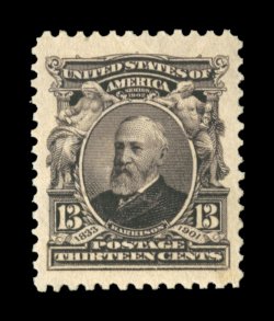 1181 nhu 308 image#308, 13c Purple black, an exciting mint single that possesses virtually perfect centering amid extraordinarily large margins, intensely rich color and a prooflike impression, unblemished o.g., n.h., extremely fine; a superb jumbo example; 1992 PF certificate and a 2005 PSE certificate (XF-Superb 95 Jumbo; SMQ $1,100.00 for 95 and $3,300.00 for 98). (Image) $115.00