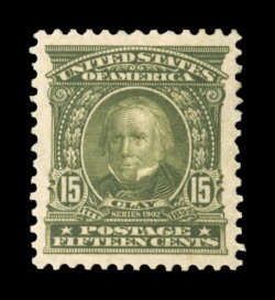 1184 nhu 309 image#309, 15c Olive green, a magnificently choice mint single, outstanding centering within exceptionally large margins, rich bright color and a crisp impression, o.g., n.h., extremely fine; a true gem example for the perfectionist; 2005 PSE certificate (XF-Superb 95; SMQ $4,800.00); one of three stamps to receive this grade, with only one slightly higher (95J). (Image) $475.00