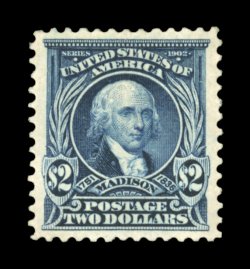 1188 ogu 312 image#312, $2.00 Dark blue, an exciting mint example that is one of the finest 1902 Two Dollar Blue stamps we have ever offered, as this gem boasts flawless centering amid remarkably wide margins, deep luxuriant color and an especially sharp impression on bright paper, o.g., lightly hinged, extremely fine; a true condition rarity in this superb quality; 1993 PF certificate and a 2005 PSE certificate (Superb 98; SMQ $3,950.00); one of only two stamps to have been assigned this coveted grade by the PSE, the highest grade awarded. (Image) $1,200.00