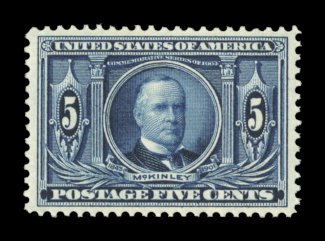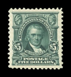 1189 ogu 313 image#313, $5.00 Dark green, the mint single offered here is, without question, the finest we have ever had the pleasure to offer in our auctions, as well as one of the finest in existence, as it possesses remarkable physical characteristics that are simply not supposed to exist on a single copy, including being absolutely perfectly centered within enormously large margins, but just as impressive is the stamp's incredible overall mint "bloom", with spectacular prooflike color and impression on bright white paper, fresh clean o.g. with just a faint trace of hinging, a superb stamp in all respects; long before grading came into vogue, stamps like this were certainly recognized as beautiful gems, but now the grading has only reinforced the fact that this is in the finest attainable quality; 2004 PSE certificate (Superb 98 Jumbo; SMQ $9,050.00 for 98); this is the sole example in the PSE population report to have been awarded this remarkable grade, the highest grade achieved (the next highest being a 95J). (Image) $3,000.00